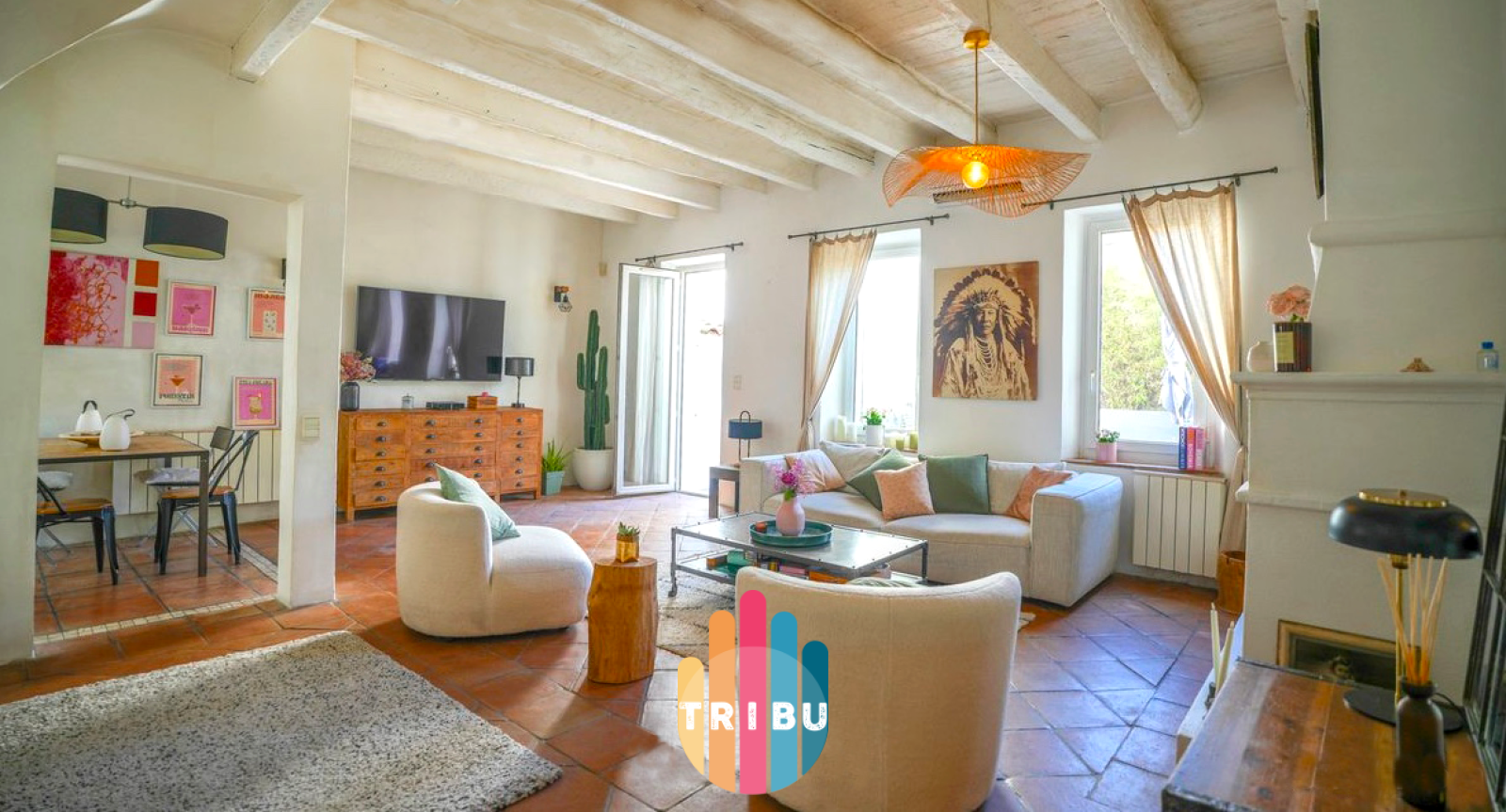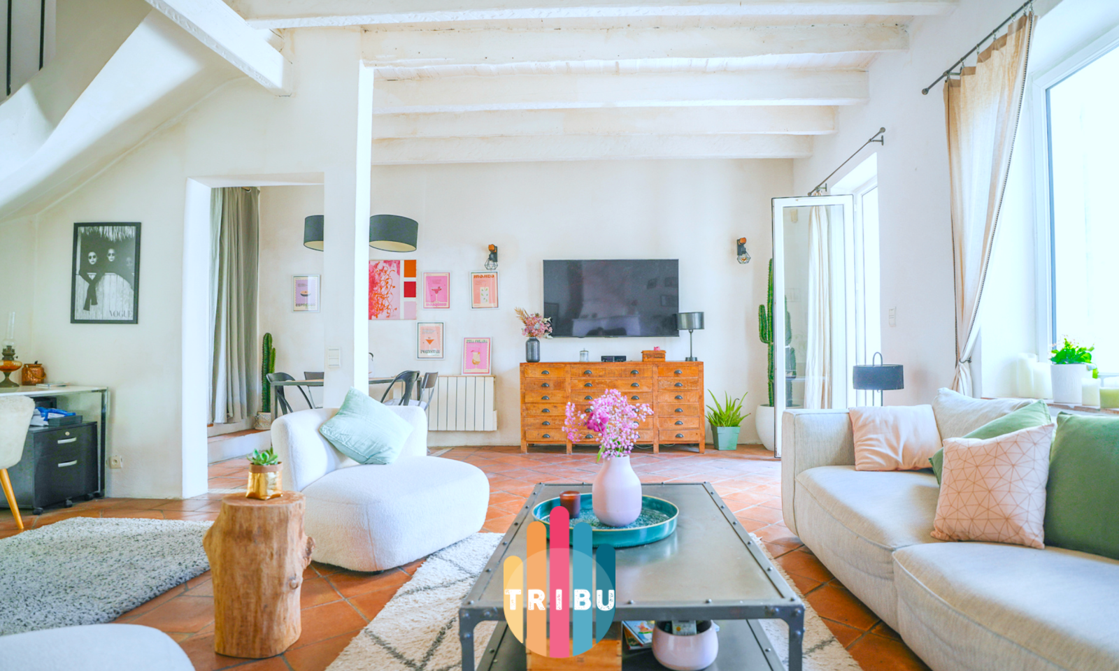 Le RDC propose un très belle espace de vie avec une belle hauteur sous plafond et poutres apparentes à la française : salon avec cheminée, salle à manger et une cuisine ouverte de 50m² donnant sur la terrasse privative de 57m² sans vis à vis.