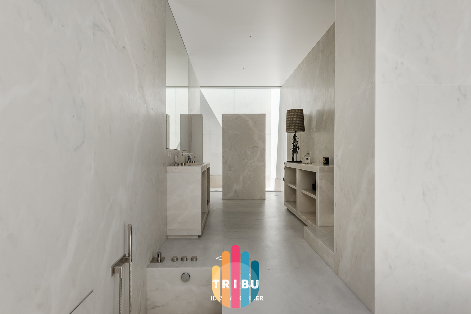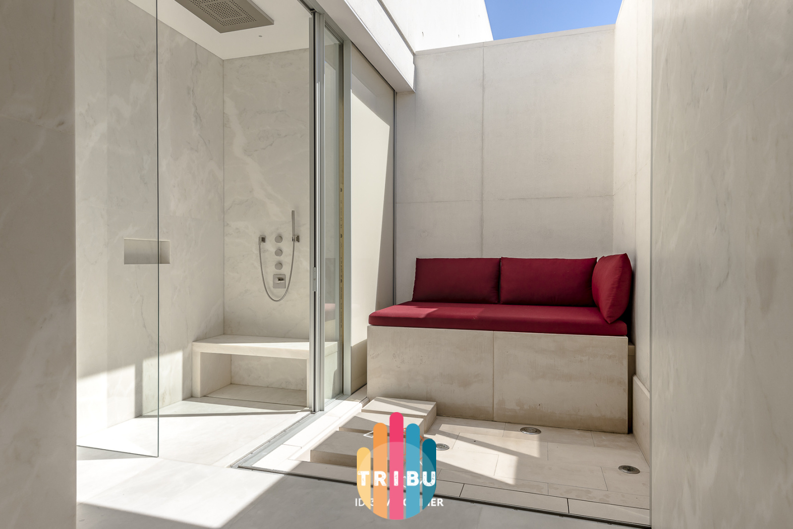 Toutes réalisées en marbre blanc adoucie mate (du sol au plafond). Les robinetteries et équipements sont de la marque Dornbracht en inox brossé.